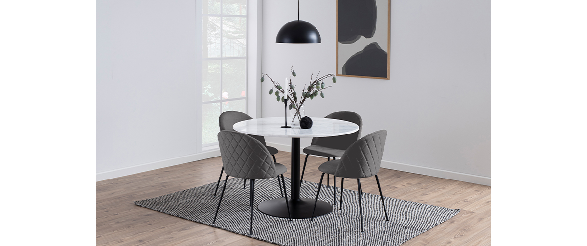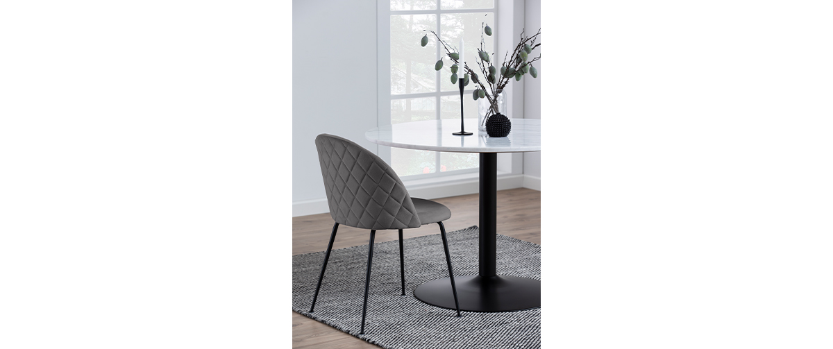 είναι μια καρέκλα μοντέρνου design, επενδεδυμένη με ύφασμα και με μεταλλικά πόδια σε μαύρη απόχρωση, που συνδυάζεται εύκολα με τραπέζια τραπεζαρίας διαφορετικού ύφους.