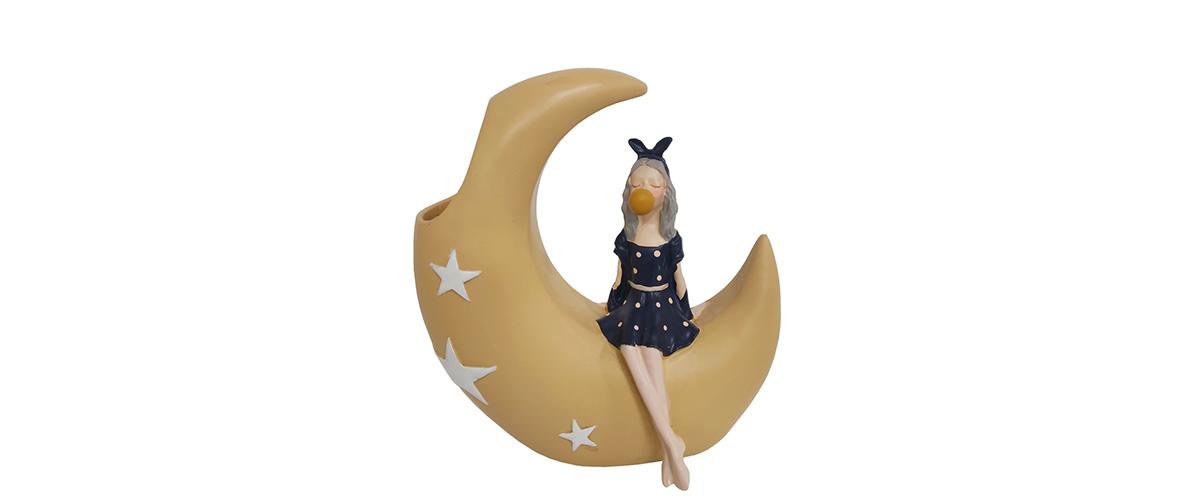 Πάνω στο μισοφέγγαρο κάθεται μια κοπέλα με κορδέλα στα μαλλιά, που φυσά μια παιχνιδιάρικη φούσκα τσίχλας, προσθέτοντας μια ζωντανή και χαρούμενη νότα σε κάθε γωνιά.