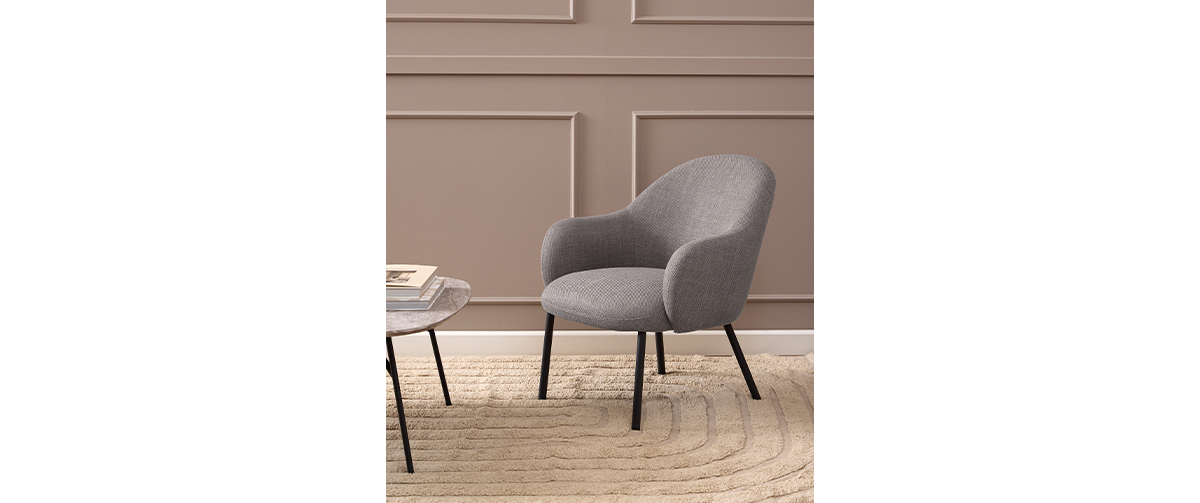 Η πολυθρόνα Spencer ξεχωρίζει με τη στρογγυλεμένη, κομψή σιλουέτα της και προσφέρει άνεση και στυλ σε κάθε χώρο lounge. Η επένδυση σε δομημένο ύφασμα ανοιχτό γκρι-καφέ με διχρωμία προσδίδει βάθος και υφή, ενώ τα στρογγυλά μαύρα μεταλλικά πόδια με ματ επίστρωση πούδρας εξασφαλίζουν σταθερότητα και διαχρονική αισθητική.