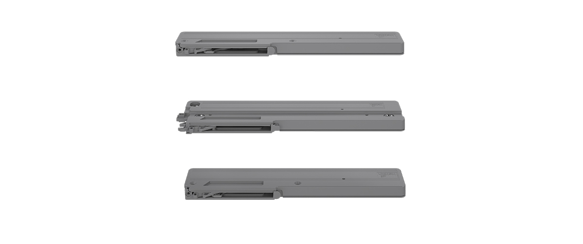 Ο μεταλλικός μηχανισμός Soft Close επιτρέπει το ομαλό και αθόρυβο άνοιγμα και κλείσιμο των συρόμενων φύλλων. Το σετ περιλαμβάνει τρία φρένα που τοποθετούνται στο αριστερό, το δεξί και το μεσαίο τμήμα της ντουλάπας.