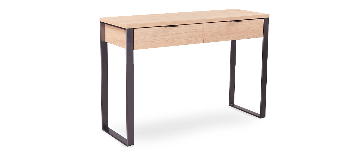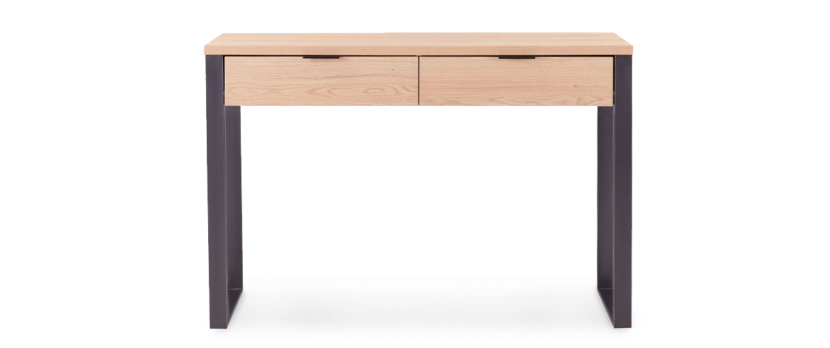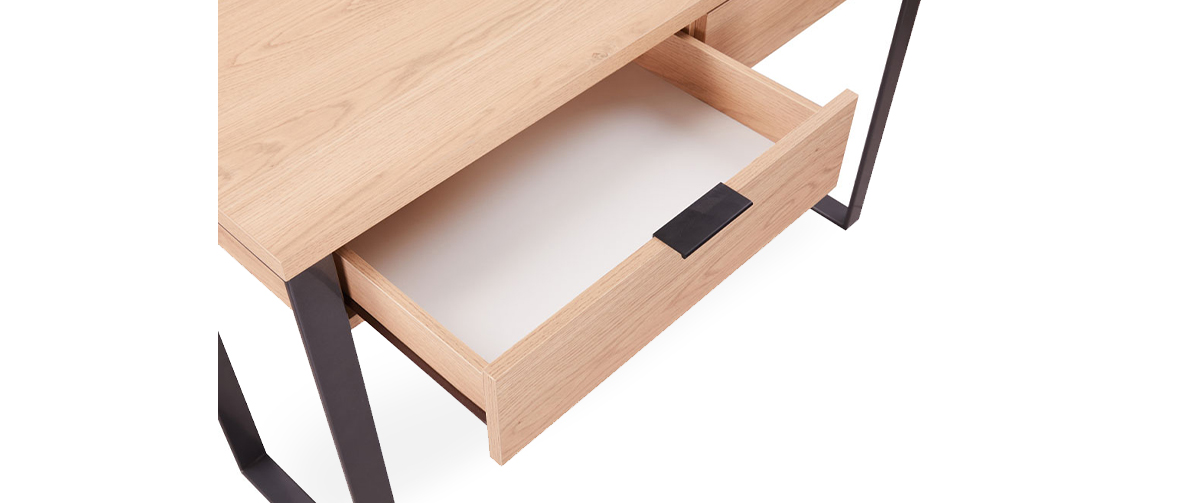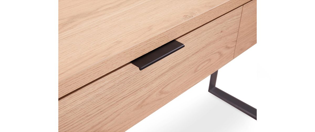 Διαθέτει δύο ευρύχωρα συρτάρια με μεταλλικά χερούλια, που ενισχύουν τη γεωμετρική καθαρότητα της μορφής της και προσφέρουν πρακτικό αποθηκευτικό χώρο.