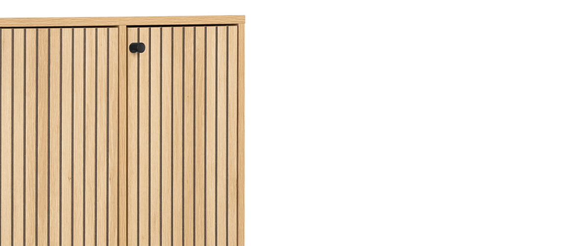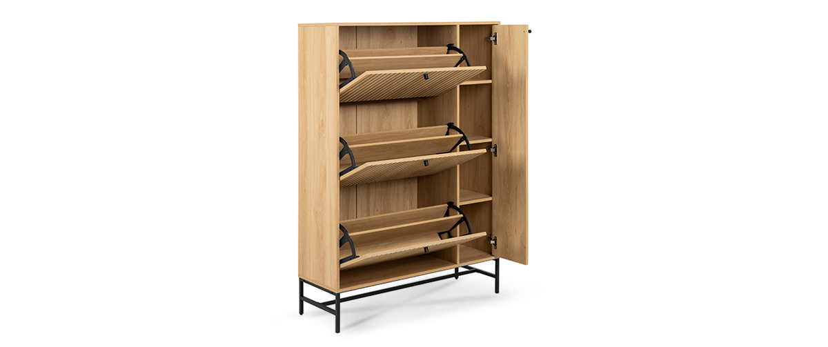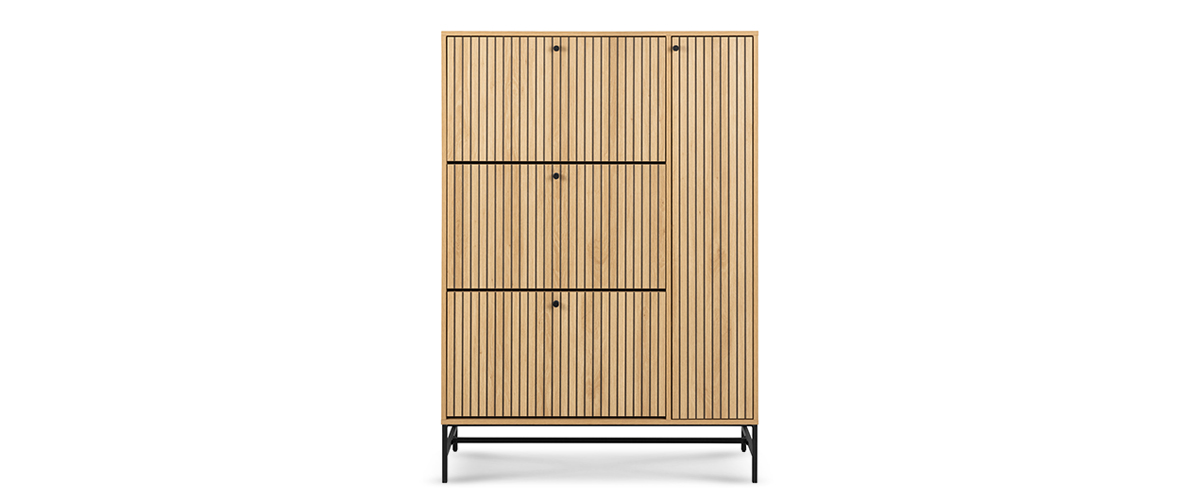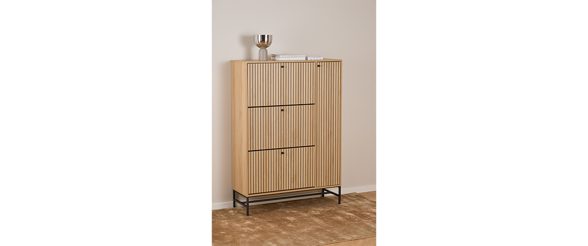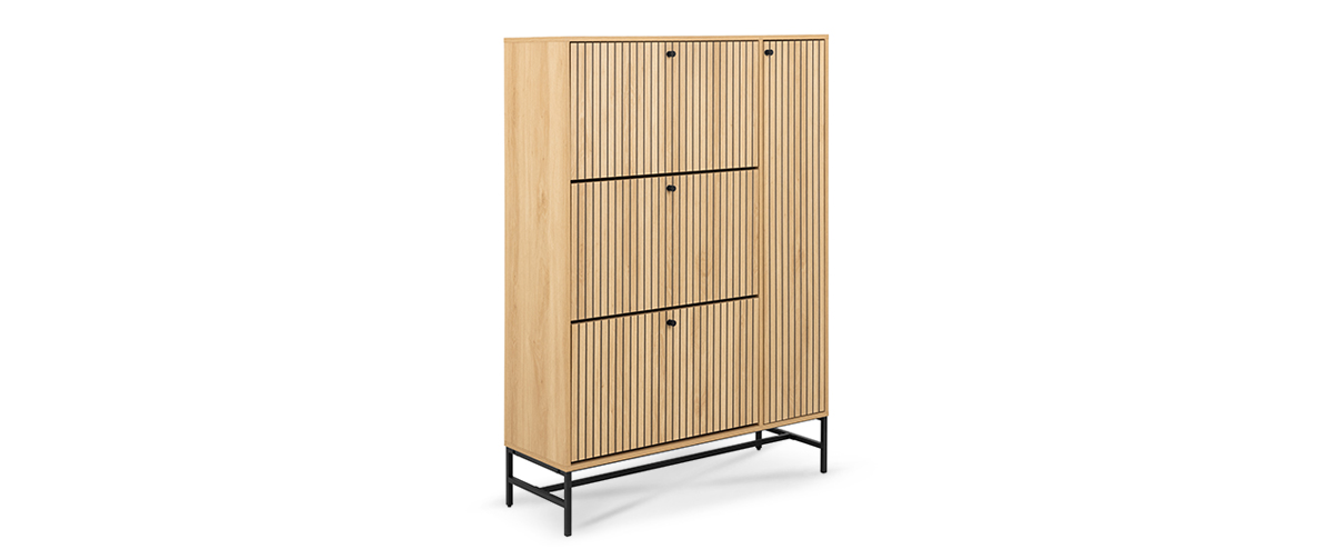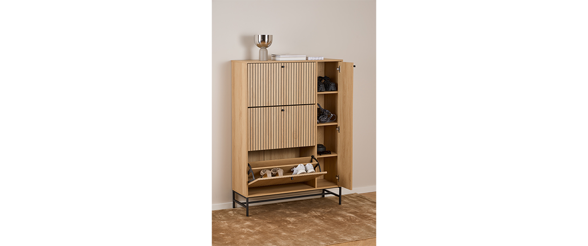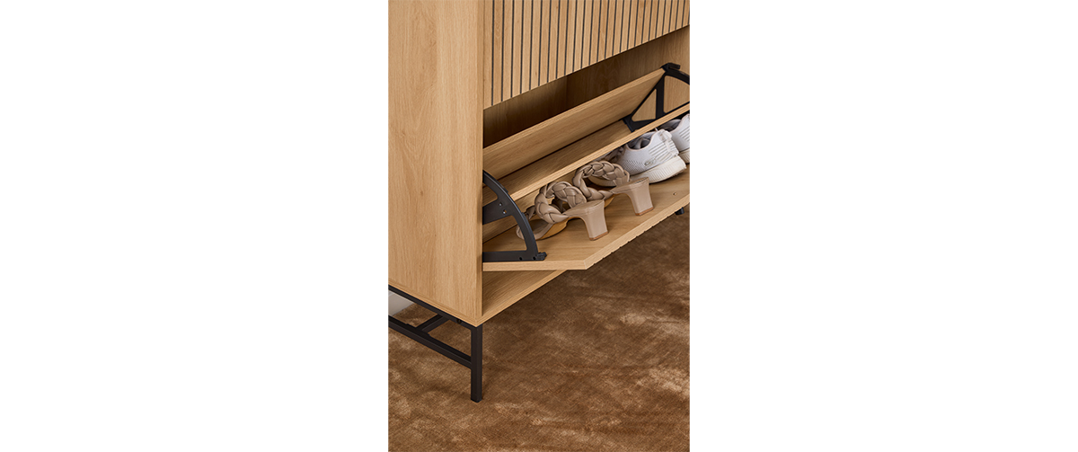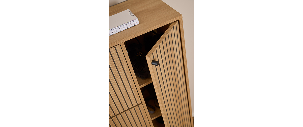 Με φυσική απόχρωση δρυς και πρόσοψη τύπου Lamella, αυτή η παπουτσοθήκη προσθέτει στυλ και πρακτικότητα στον χώρο του χολ.