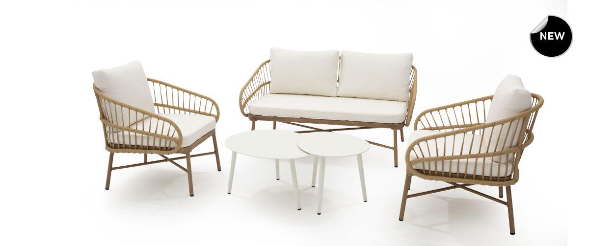 Το σετ περιλαμβάνει έναν άνετο διθέσιο καναπέ, δύο πολυθρόνες και δύο τραπεζάκια σαλονιού. Τα μαλακά μπεζ μαξιλάρια προσθέτουν επιπλέον άνεση και κομψότητα, ενώ ο minimal σχεδιασμός του σετ ταιριάζει εύκολα σε σύγχρονες βεράντες, κήπους ή καθιστικούς χώρους.
