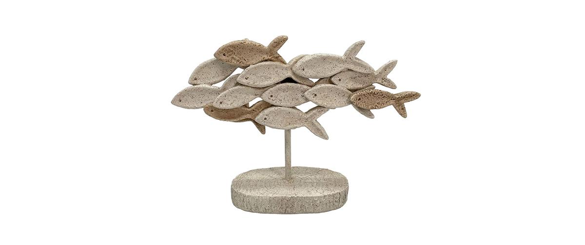 Το γλυπτό παρουσιάζει μια σύνθεση ψαριών σε κίνηση, τοποθετημένη πάνω σε μια λεπτή βάση, δημιουργώντας μια αίσθηση ροής και αρμονίας.