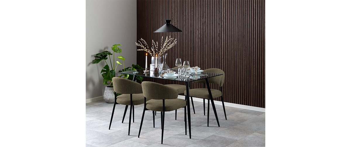 The Edina dining chair with Basel fabric and matte black steel base brings your dining room to life with its elegance.