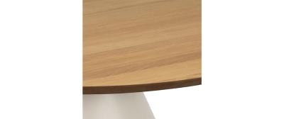 The Soli round coffee table, with a smoked oak surface with a PU varnished finish and a gray steel base,