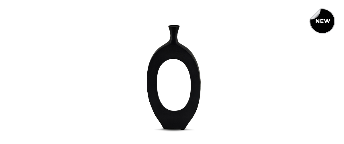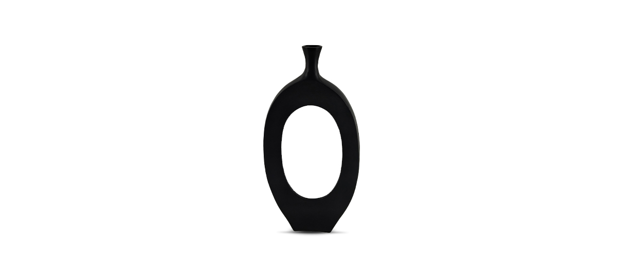 Made from black aluminum, it features rounded curves and a hollow central cavity, creating a sense of lightness and modern design.